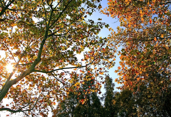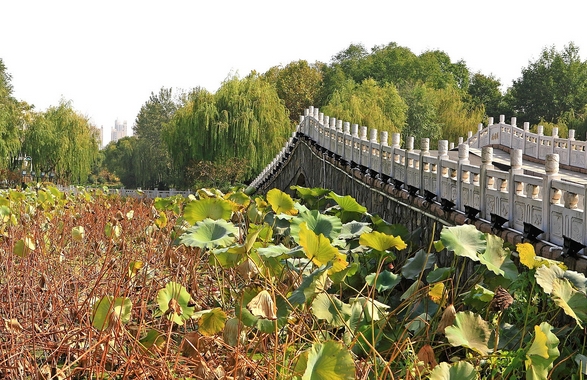 虽然已进入冬季,沫浴在阳光中的公园基调也还是红绿黄交错,随风飘荡的垂柳,依然郁郁葱葱,没有落叶,如果不是水塘里荷叶稍枯,艳红如火的枫叶掺杂其中,游人会忘却冬已来临。