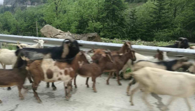 返回路上,改走省道210,此时天空晴朗,眼前可见的是“蓝天、白云、青山”,走过一个道口,一群羊阻滞了车队,我不由感慨的说:“运气不好,羊也堵路”,在群里刚上传,微友们的祝贺声接踵而至,秀珍言:“遇羊好运,祥!祝一路好运!”景先更是夸张的说:“烤全羊”。
