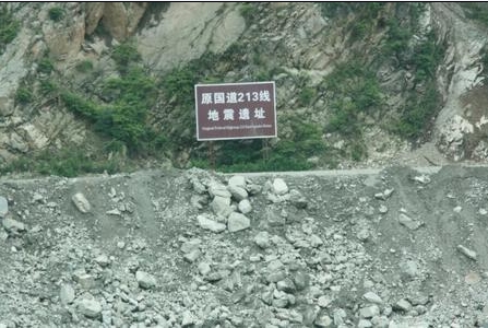 突然,前方的一个画面令人震慑,在两座山形成的山谷间,地震发生时因山洪暴发,山顶泥石流顺坡冲击留下的泥沙碎石堆历历在目,几乎将整个谷底填充,可以想象当时的惨烈场面,如今这个遗址仍然保留,用以警示后人。