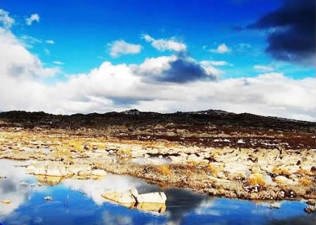 饭后,天色放睛,我们继续赶路, 翻越今日的最后一座高山海子山,它位于稻城北部平均海拔4300-4700米。该高原面是青藏高原最大的古冰体遗迹,即“稻城古冰帽”。嶙峋怪石及大小海子星罗棋布,在平均海拔4500米高的山上,1145个大小海子如上帝失手撒下的一千颗钻石一般闪烁在山间,其规模密度为中国之最。海子山独特的景观是大大小小的的花岗石漂砾(砾石)组成的石河、石海及形态各异的冰蚀岩盆(海子)。目光所及没有树木、河流,就连野草也只是偶尔丛生,“蛮荒”得像是“勇气号”拍摄的火星表面。对于海子山,游客的反应往往不同,有人喜其“蛮荒”,下了车便不舍离去,而有人则厌其“苍凉”匆匆逃之夭夭。不管怎么样,海子山都有着不同于景区岁月的独特魅力,值得每一个路过的游客驻足细品。