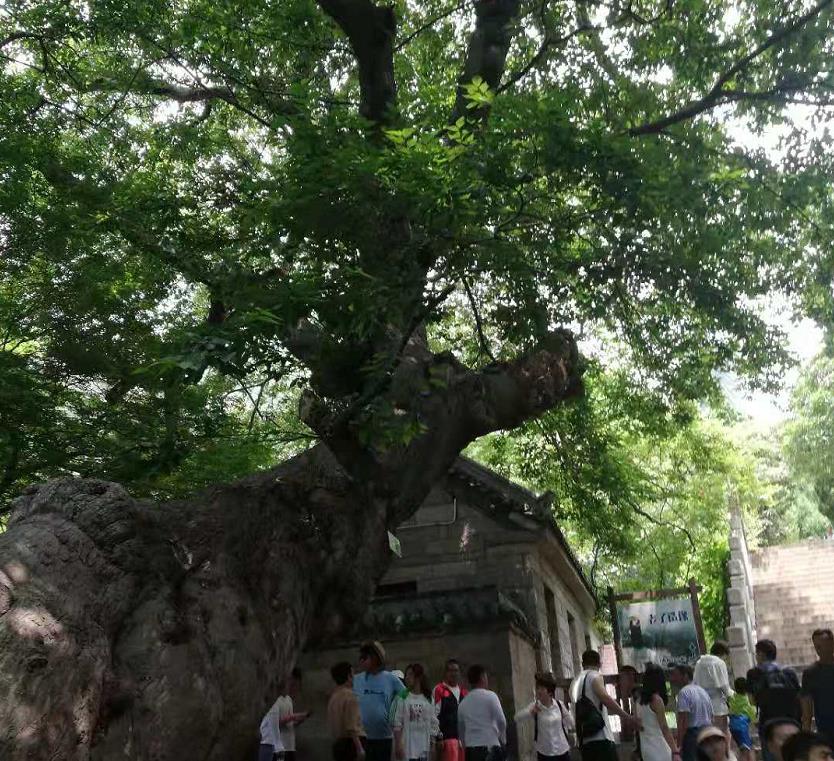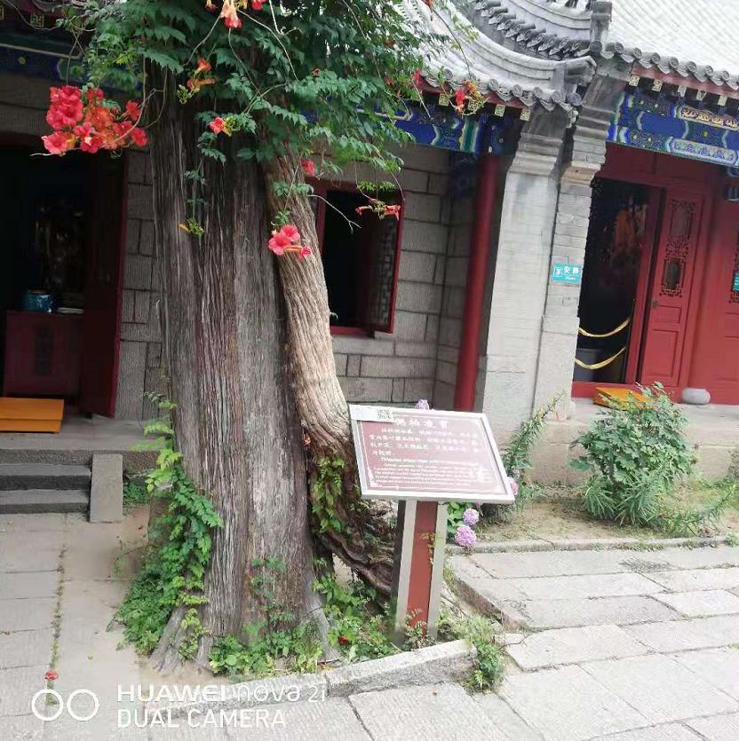 三皇殿内一颗高大的树木引人注目,这是一颗跨越千年的的桧柏,是汉代才子张廉夫亲手栽植。树上寄生了一颗凌霄树,这一奇景被后人称之为“汉柏凌霄”,树北面的一颗枝上又衍生了一株“刺楸”,如蛟龙蜿蜒缠绕,攀附柏树生长而又凌驾于其上,俗称“三树一体”。游人都被这奇观所震撼,其展示着顽强不息、传承生命的脍语!