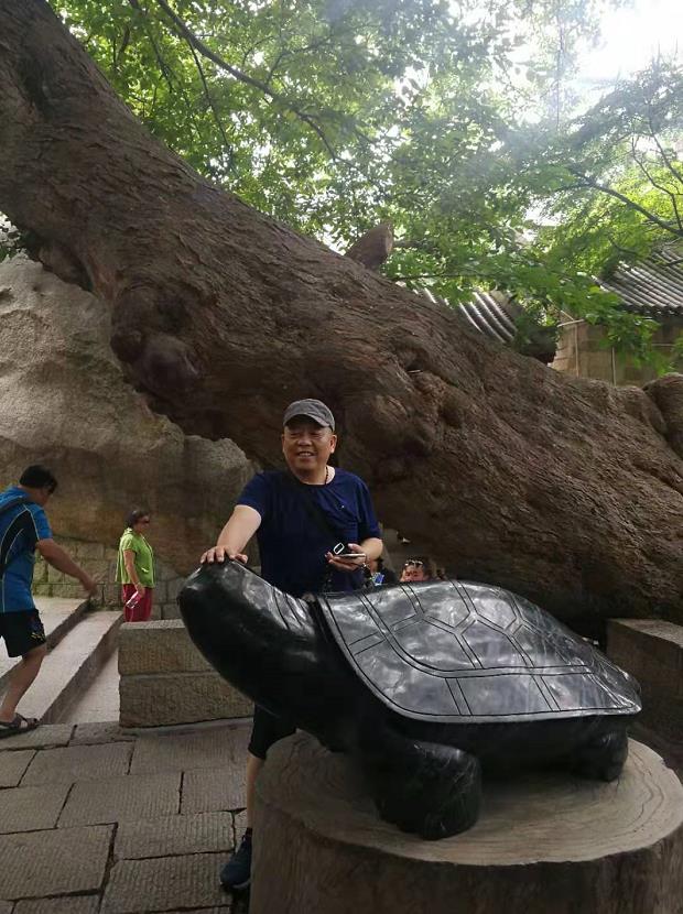 过了逢仙桥,就看到一颗弯弯曲曲的“唐榆”它树干盘延,形状似龙头,俗称“龙头榆”,许多游客到此,与神树合影,都想沾一下千年的喜气。满身尽墨的司命之神----“崂山绿石龟”,引起了我们的兴趣,在导游的忽悠下,我也摸摸龟头,轻抚龟背,为自己和家人祈福延年益寿。