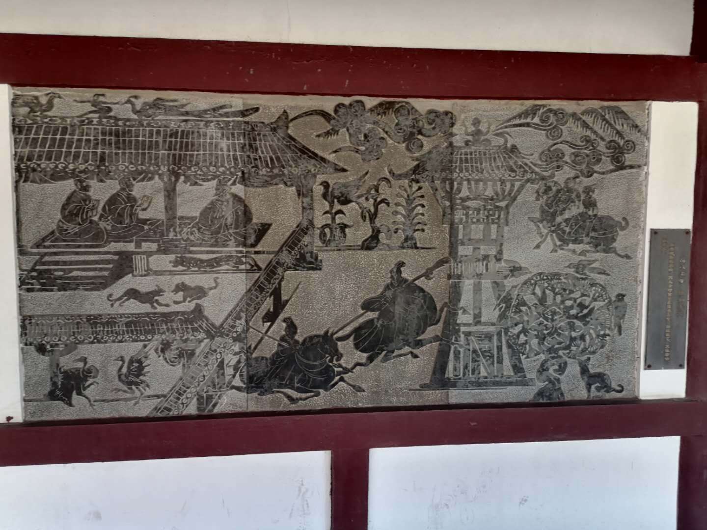 像后广场有锻铜浮雕面壁,千军万马,驾船冲阵,展露了东吴水军的荡寇强势;行走在园内的步道上,可以看到步道旁有不少的汉画像石,图案表现了汉代的绘画艺术,让人拍案叫绝;