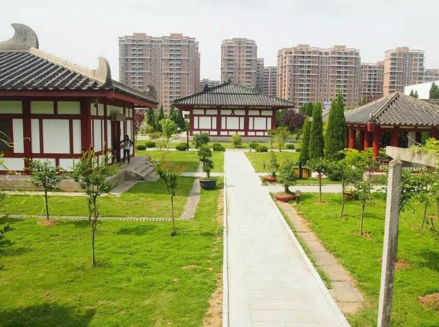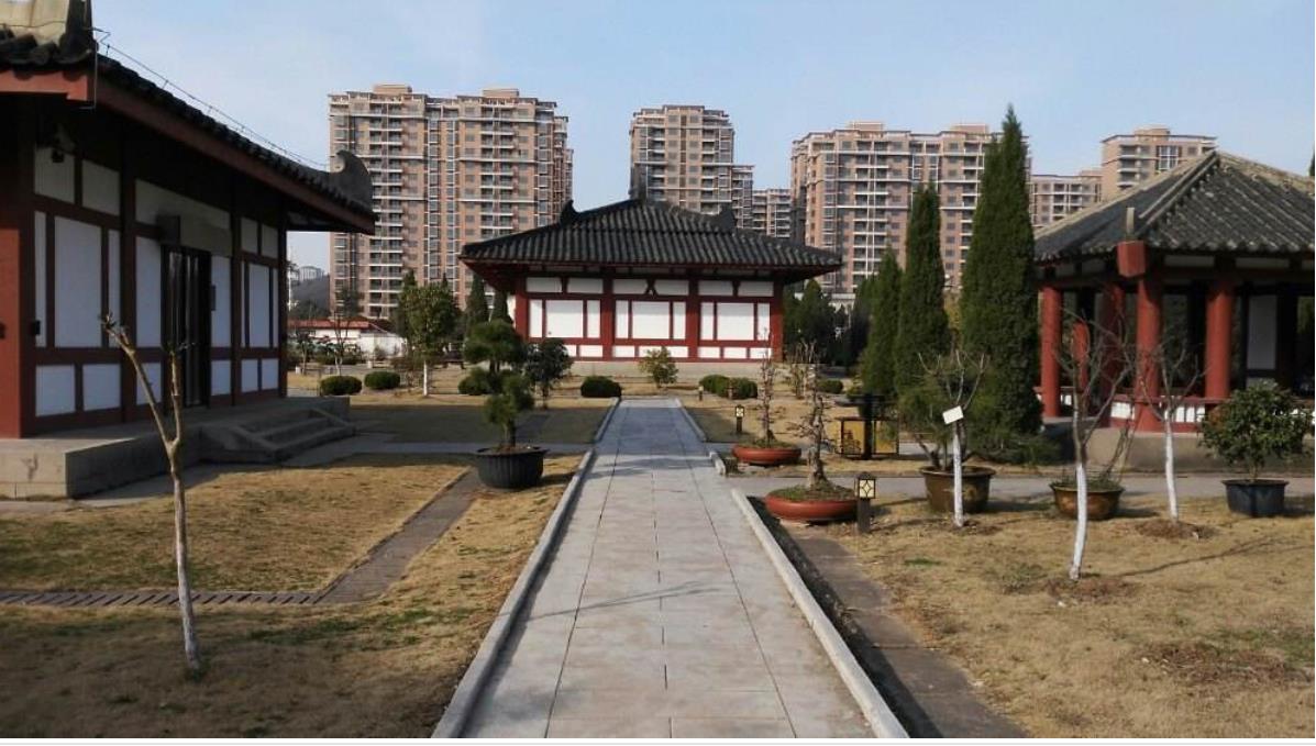 踏上八层石阶,走进大门,一组仿汉风格的古典建筑群跃入眼帘,朱然墓室陈列厅、出土文物陈列厅、朱然生平浮雕长廊、仿古兵器馆、朱然家族墓陈列厅、望楼钟鼓等场馆让人目不暇接。各馆由石板铺设的甬道相联,道旁由剪裁平整的冬青陪伴,草坪中的松柏犹如执戟的武士,卫护着千年古冢;错落有序的展馆,把游人带入了古角铮鸣的战争画面,诉说着当年东吴水军的昔日辉煌;朱然墓室陈列厅,人字纹铺砌,“三顺一丁”的墙体砌法,及漆器上彩绘人物故事和动植物纹图案,反映了1700多年前三国时代的社会风貌。